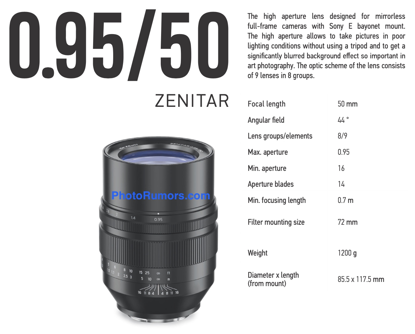 Zenitar-50mm-f0.95-E-mount-lens-specifications