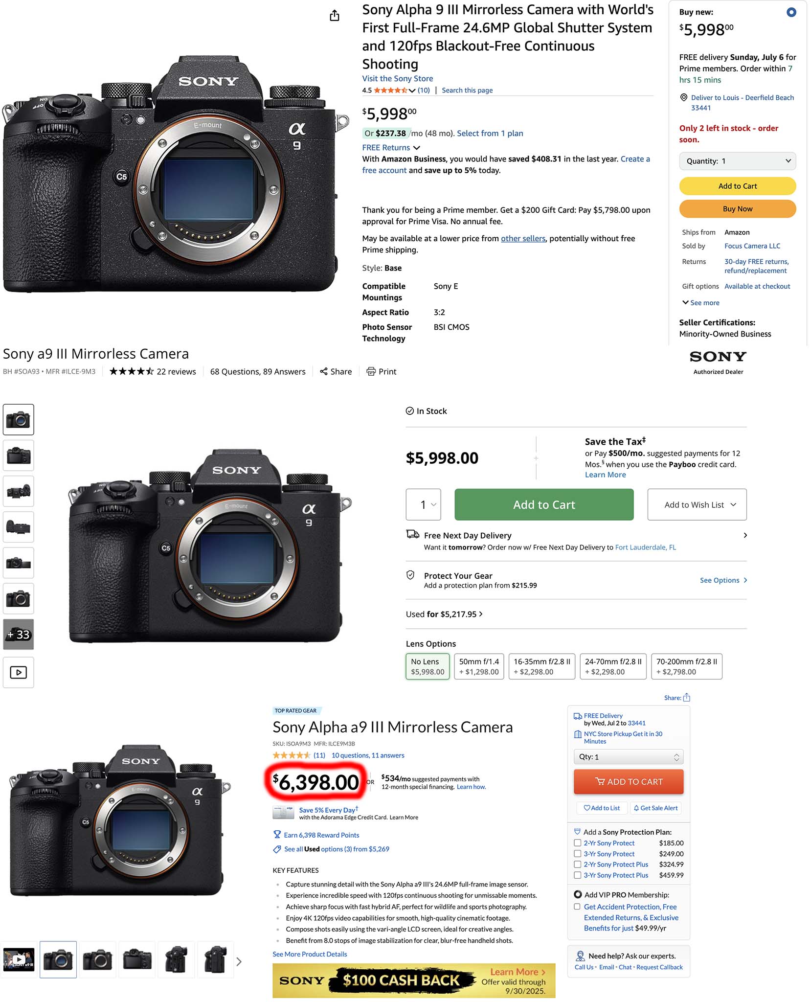 - Sony A9III: $5999.99 → $6399.99 B&H Photo / Amazon