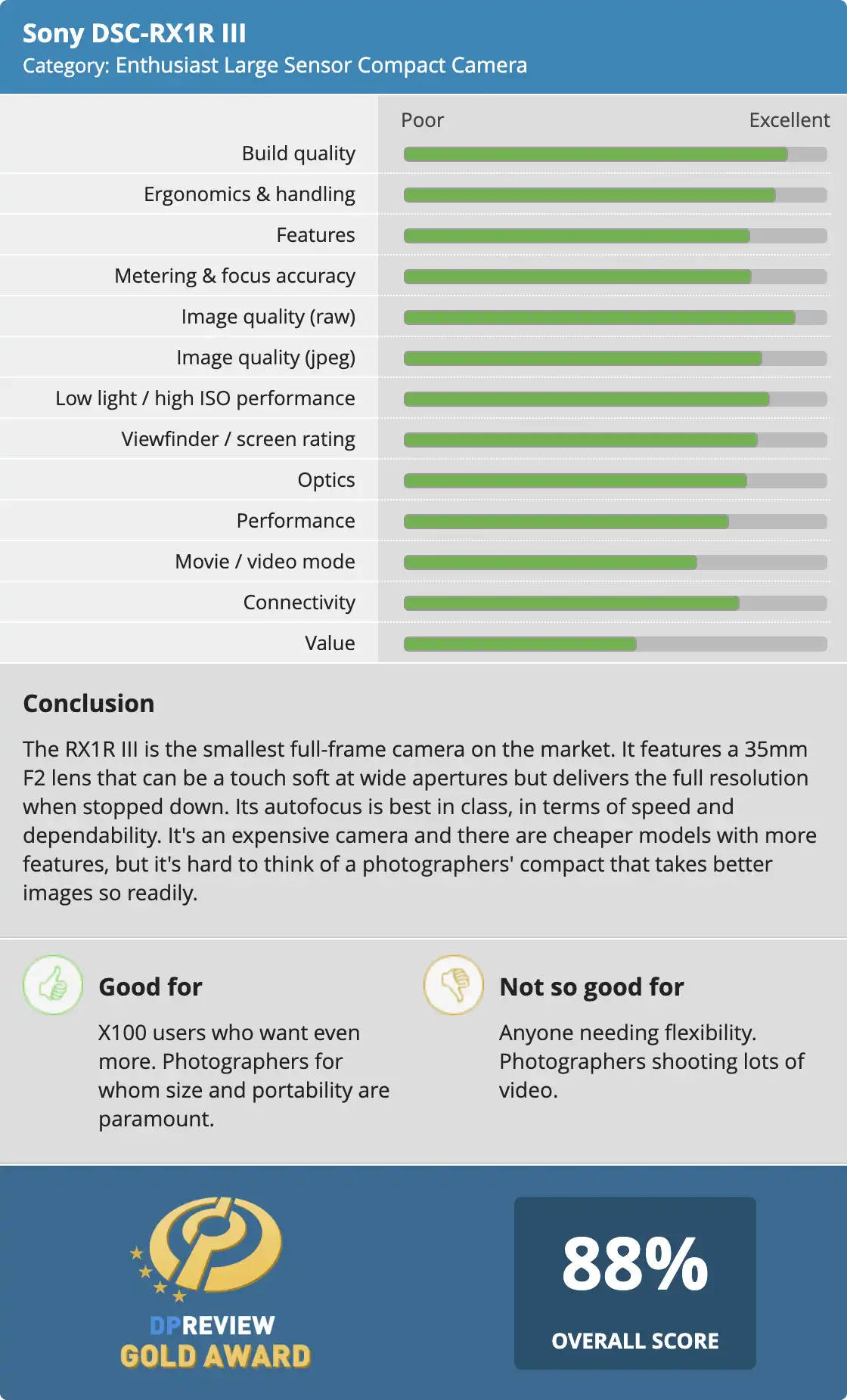 DPR published its full review of the Sony RX1R III, and the camera has earned a Gold Award from DPR with an 88%. You can read the full review here or check out the studio scene results here.