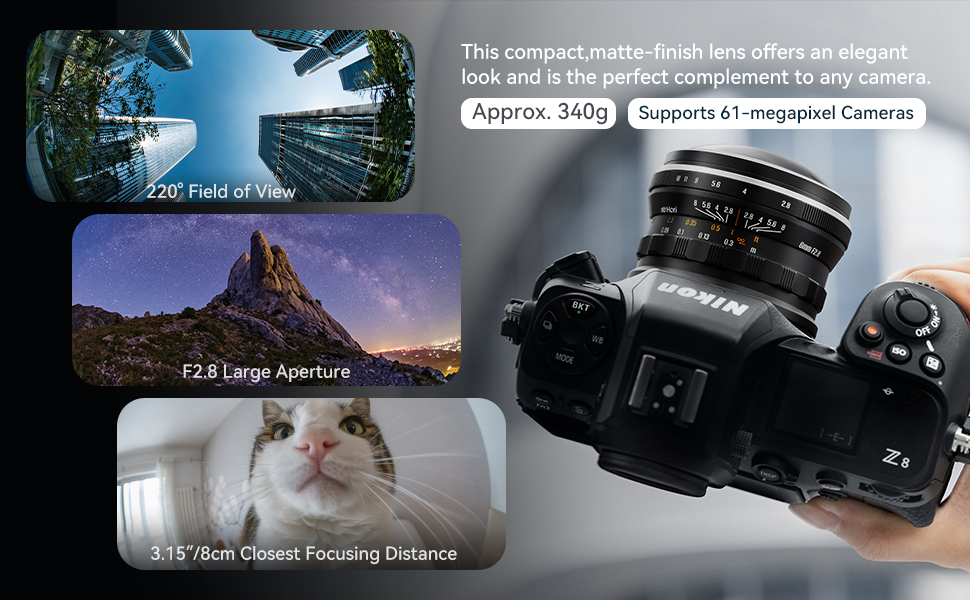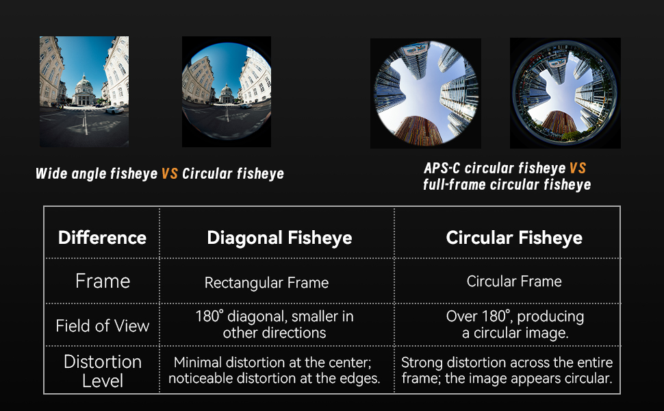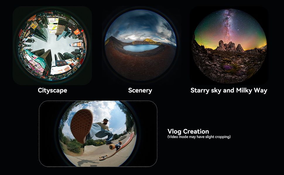 - 220° Circular Diagonal Viewing Angle:The combination of 220° spherical field of view and circular frame can produce exaggerated barrel distortion to distort the building and create a surreal sci-fi movie feeling.Creativity is fully unleashed,and visual games are created at your will. City street scenes can be turned into a dome bubbles, and the Milky Way can be turned into a space-time vortex.