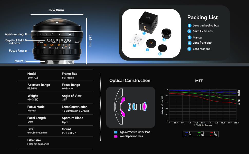 - AstrHori 6mm F2.8 Full Frame Ultra-wide Circular Fisheye Lens :Exqusite full metal body,elegant frosted material,durable,lightweight apperance and 330g weighs.With 10 elements in 8 groups optical structure, built-in 8 piece diaphragm blades,it allows you smooth de-click the aperture to get a perfect creativity photos.