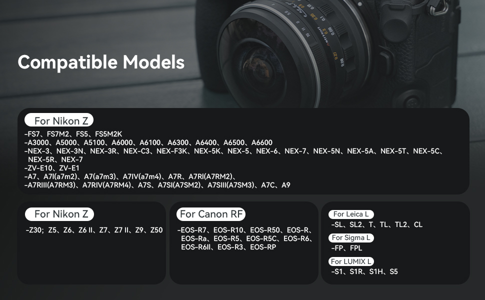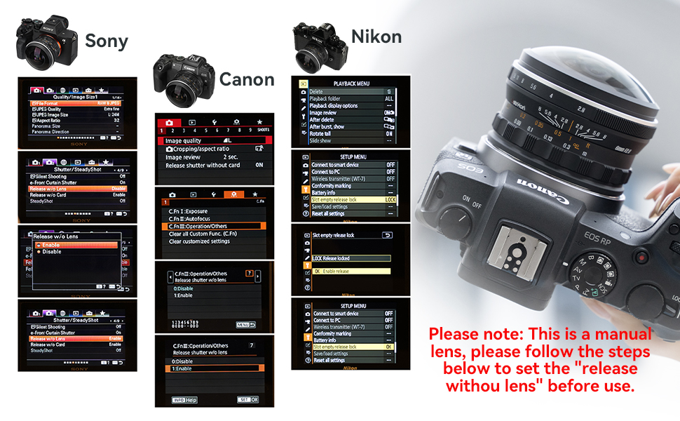 - Compatible Camera Models:This is a manual focus lens and you need to set “release without lens”before using it,otherwise the shutter cannot be pressed normally.If you don’t know how to set,please contact customer service.It compatible with Canon RF mount Full Frame Mirrorless Cameras.