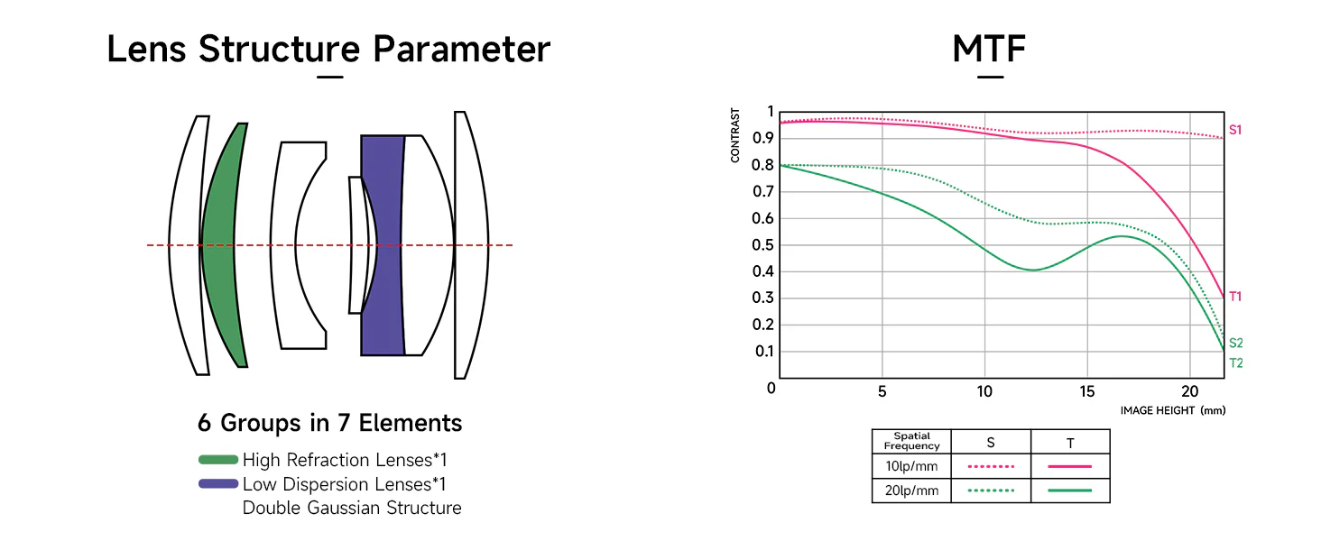 - Lens design: 7 elements in 6 groups (LD + HR elements)