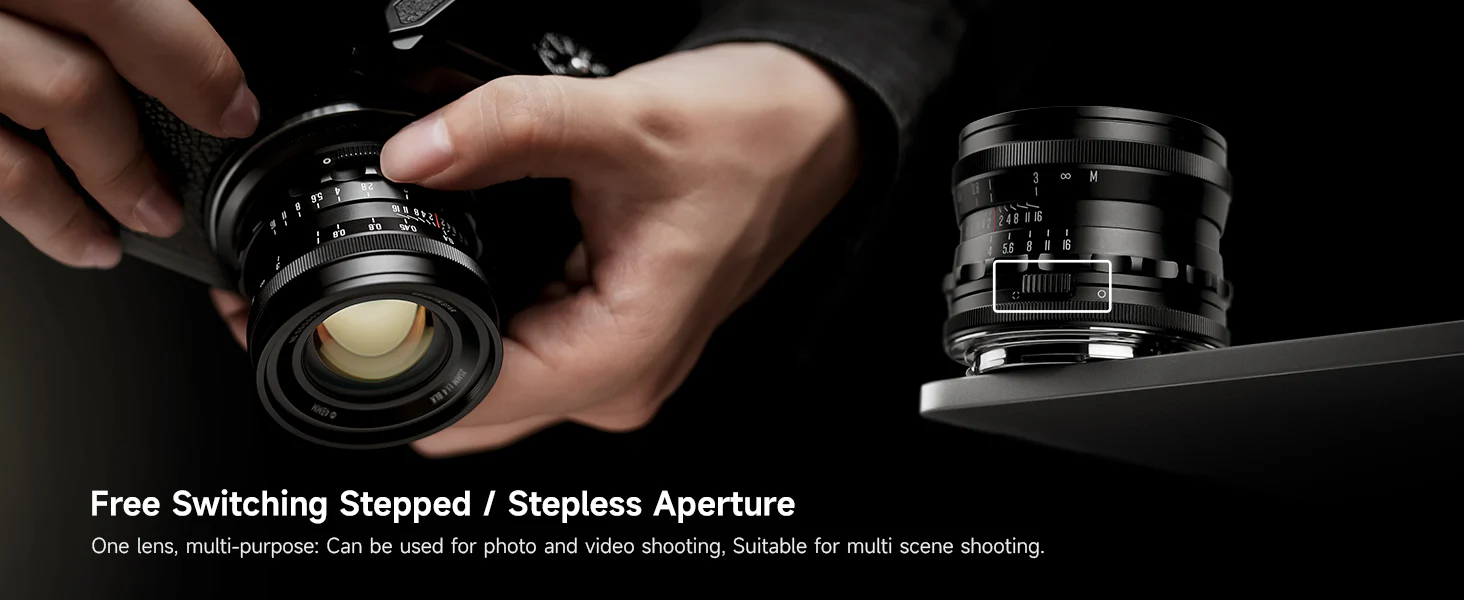 - Click / De-click aperture – precise for stills, fluid for video