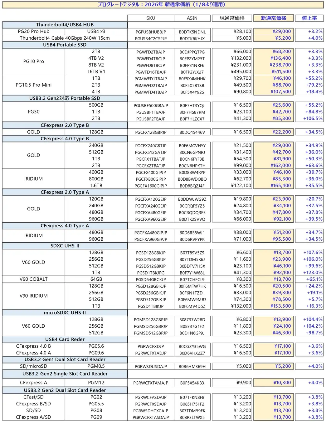 Due to the rapid increase in demand for semiconductor memory associated with the construction of AI infrastructure, and the resulting significant increase in flash memory prices, ProGrade Digital Inc. will raise the regular prices on the Amazon.co.jp ProGrade Digital Inc. store on January 8, 2026. At the same time, the exchange rate, currently $1 = 150 yen, will be changed to $1 = 155 yen to reflect the current exchange rate. Please refer to the price list for the new regular prices.