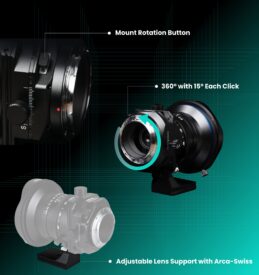 The 17mm f/4 is engineered for a seamless professional workflow, featuring an integrated Arca-Swiss lens support that allows for direct mounting to a tripod without the need for extra plates. For maximum versatility, the lens includes a 360-degree lens body rotation mechanism that features precise clicks every 15 degrees. This allows photographers to quickly and accurately switch between vertical, horizontal, and diagonal orientations.