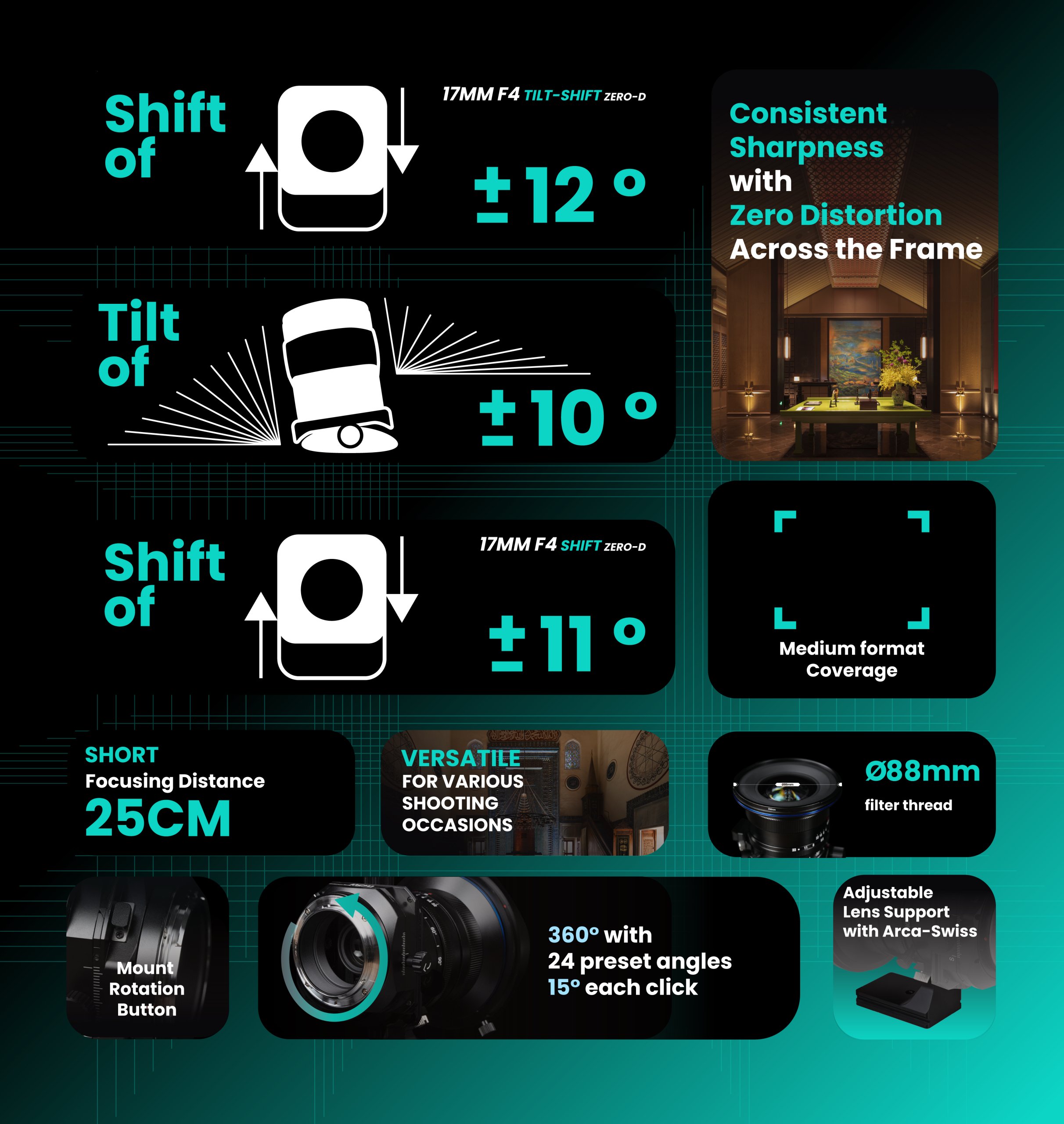 Laowa, a leading innovator in camera lens design, proudly announces the dual launch of the Laowa 17mm f/4 Zero-D Tilt-Shift and the 17mm f/4 Zero-D Shift. These lenses introduce a new era of precision for architectural and landscape photography, combining an ultra-wide 104° angle of view with unparalleled perspective control. Pairing the ±12mm shift capability for the tilt-shift version ±11mm for the shift version, and with the signature Zero-D design, they effectively eliminate optical distortion and the keystone effect, ensuring perfectly straight lines for every professional application. Although the lenses are designed primarily for full-frame mirrorless cameras, the expansive image circle provides ample coverage for medium format sensors with an incredible ±8mm shift capability. With the tilt-shift version, photographers gain control over the focus plane, allowing for both technical selective focus and the creative miniature effect. Both lenses offer a great blend of technical correction and artistic freedom, along with benefits such as a 360° rotation mechanism for seamless stitching, a 25cm close-focusing distance, and 14 aperture blades.